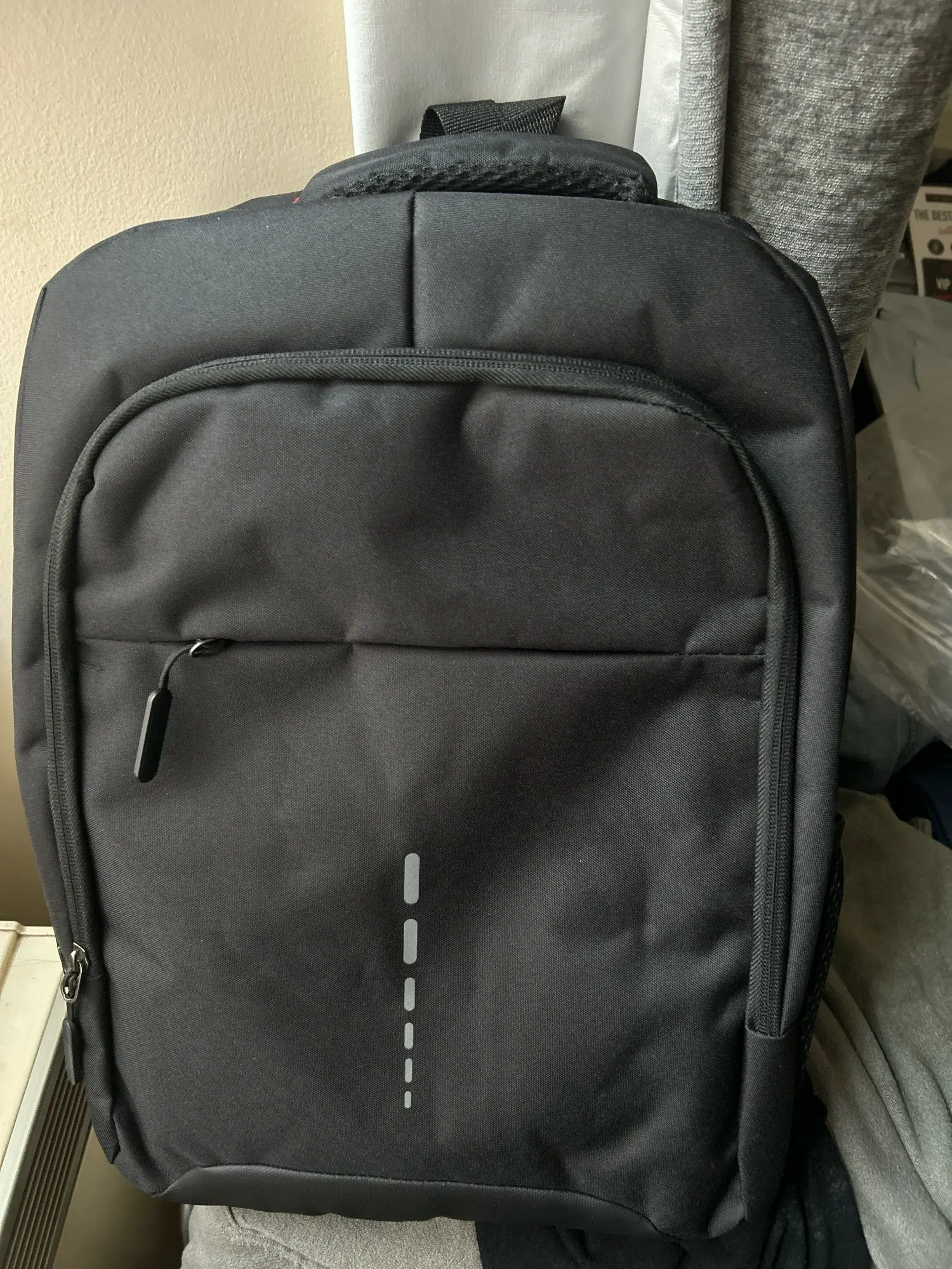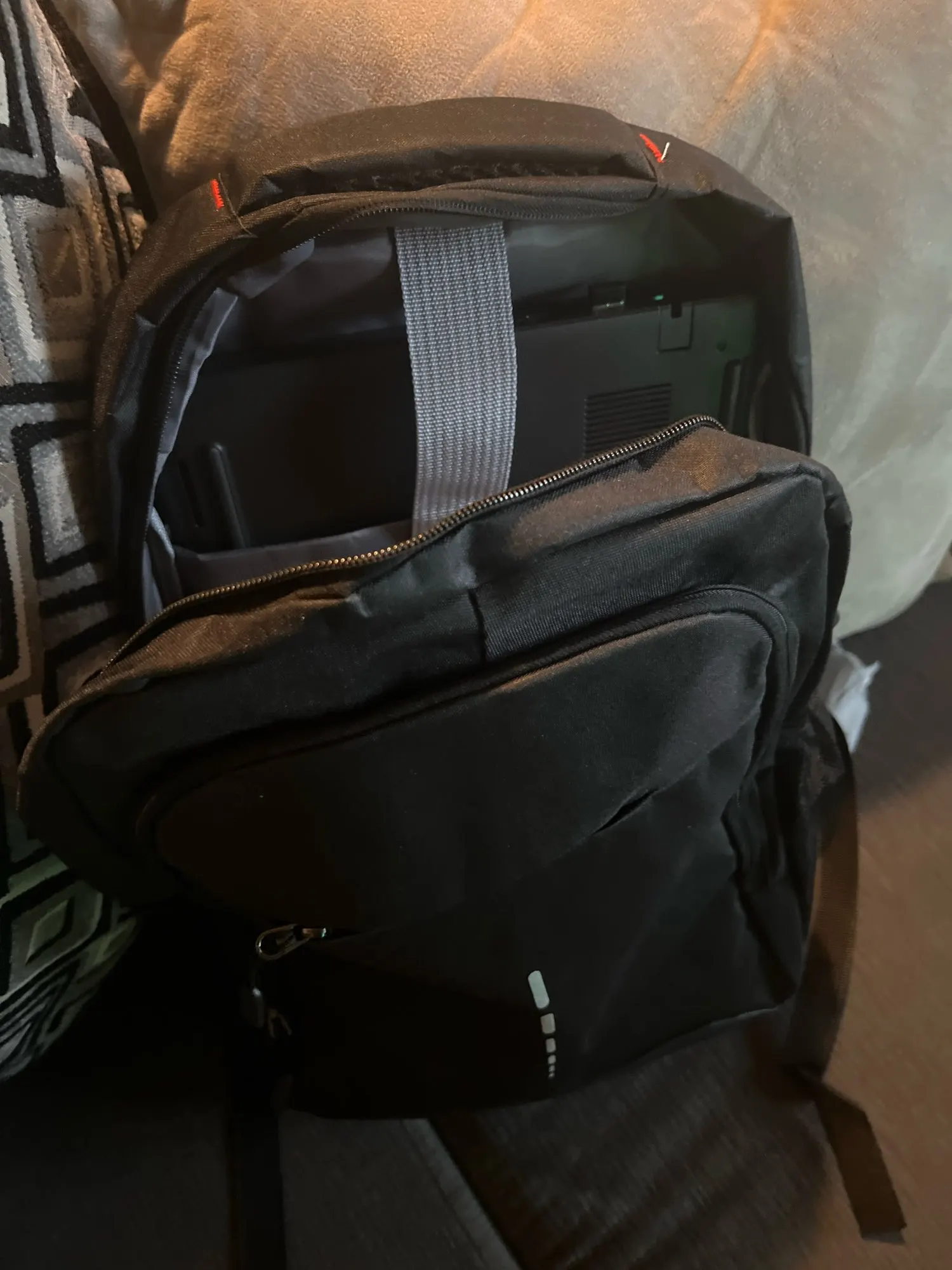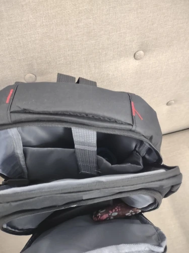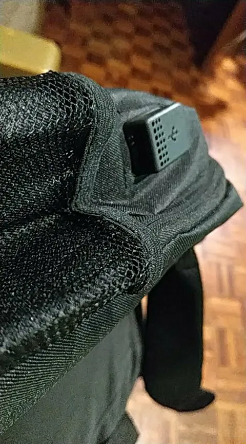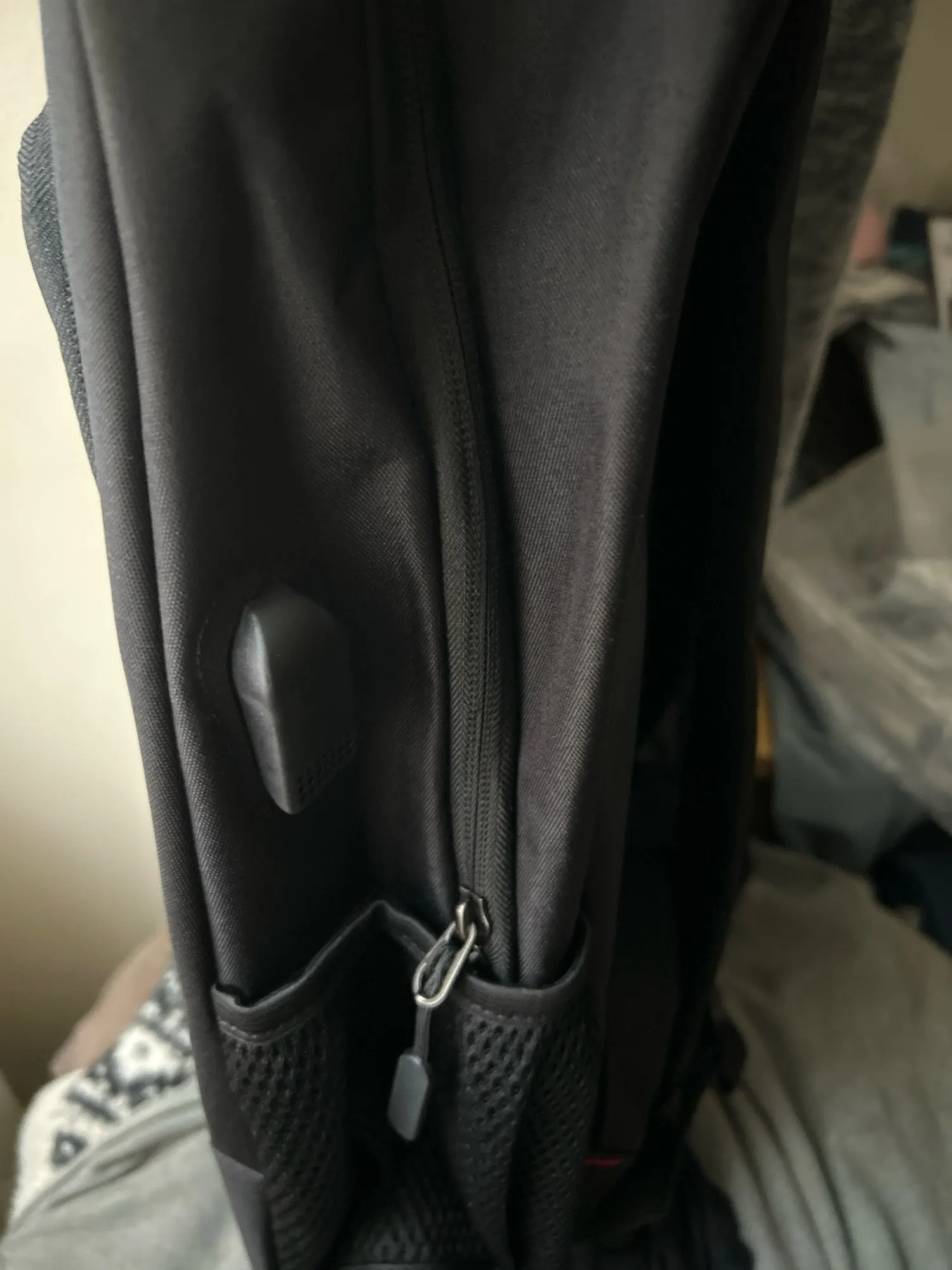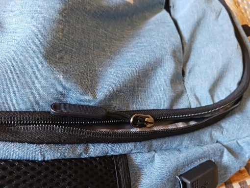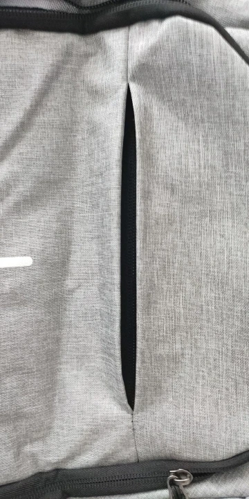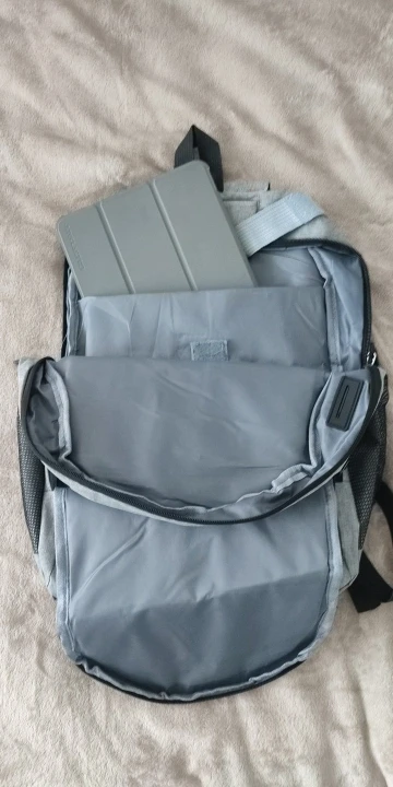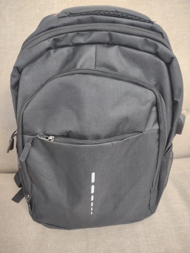 Internal space: Main space with a laptop pad and two front compartments, with separate mesh nets on the sides and rubber reinforcement at the charging cable exit.